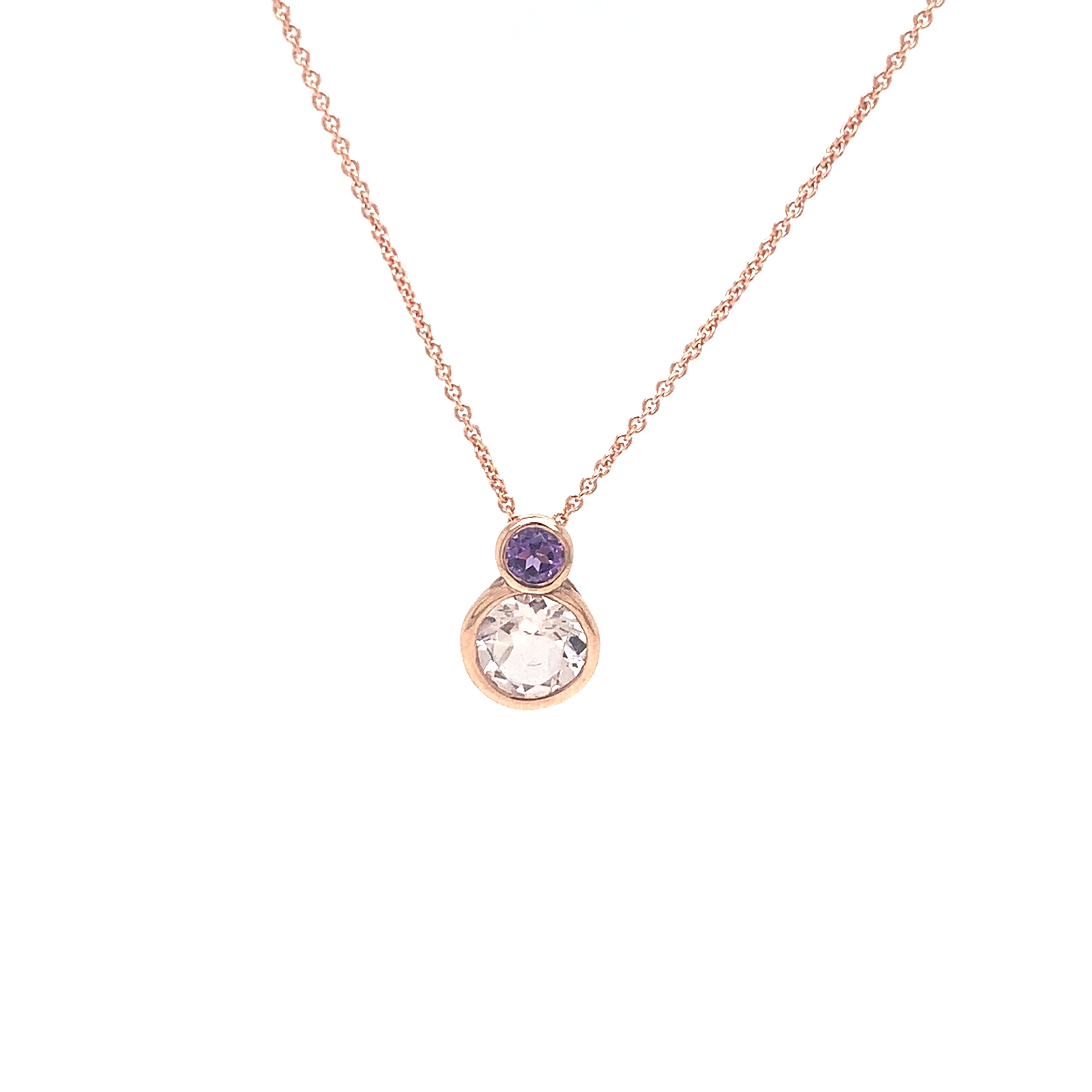 Elevate your elegance with the Blush Amethyst pendant, featuring a stunning morganite and amethyst set in warm 9 karat rose gold. This exquisite combination offers a captivating blend of soft pink and rich purple hues, perfect for adding a touch of sophistication to any outfit.