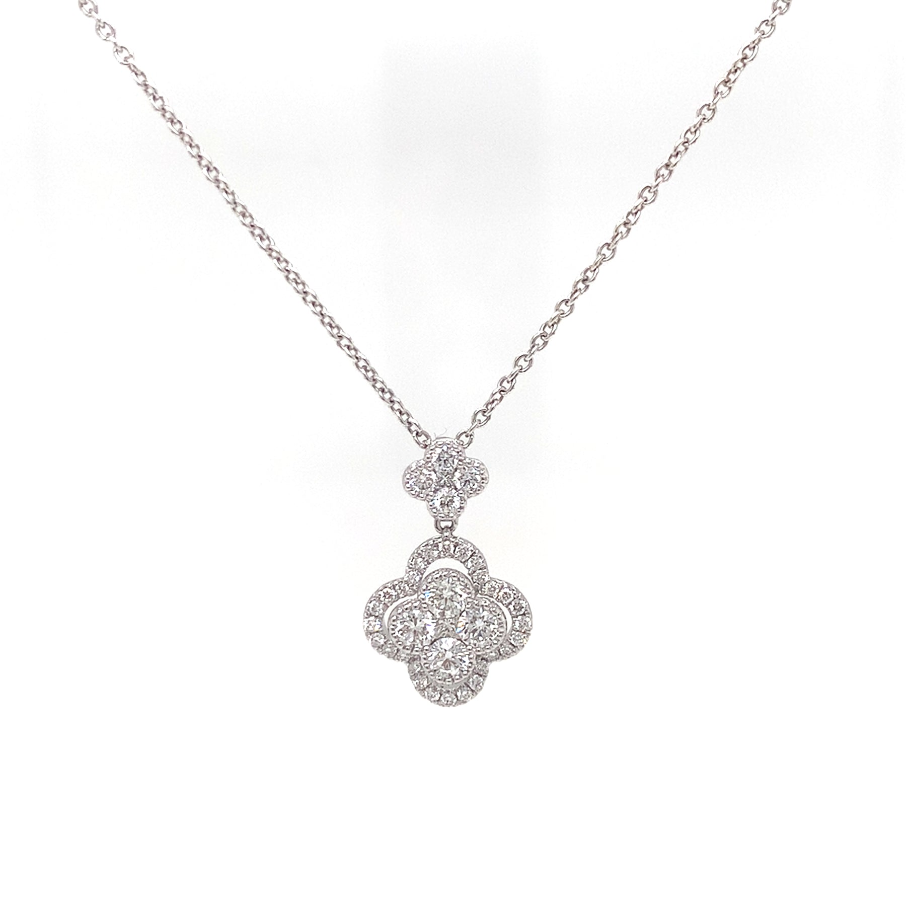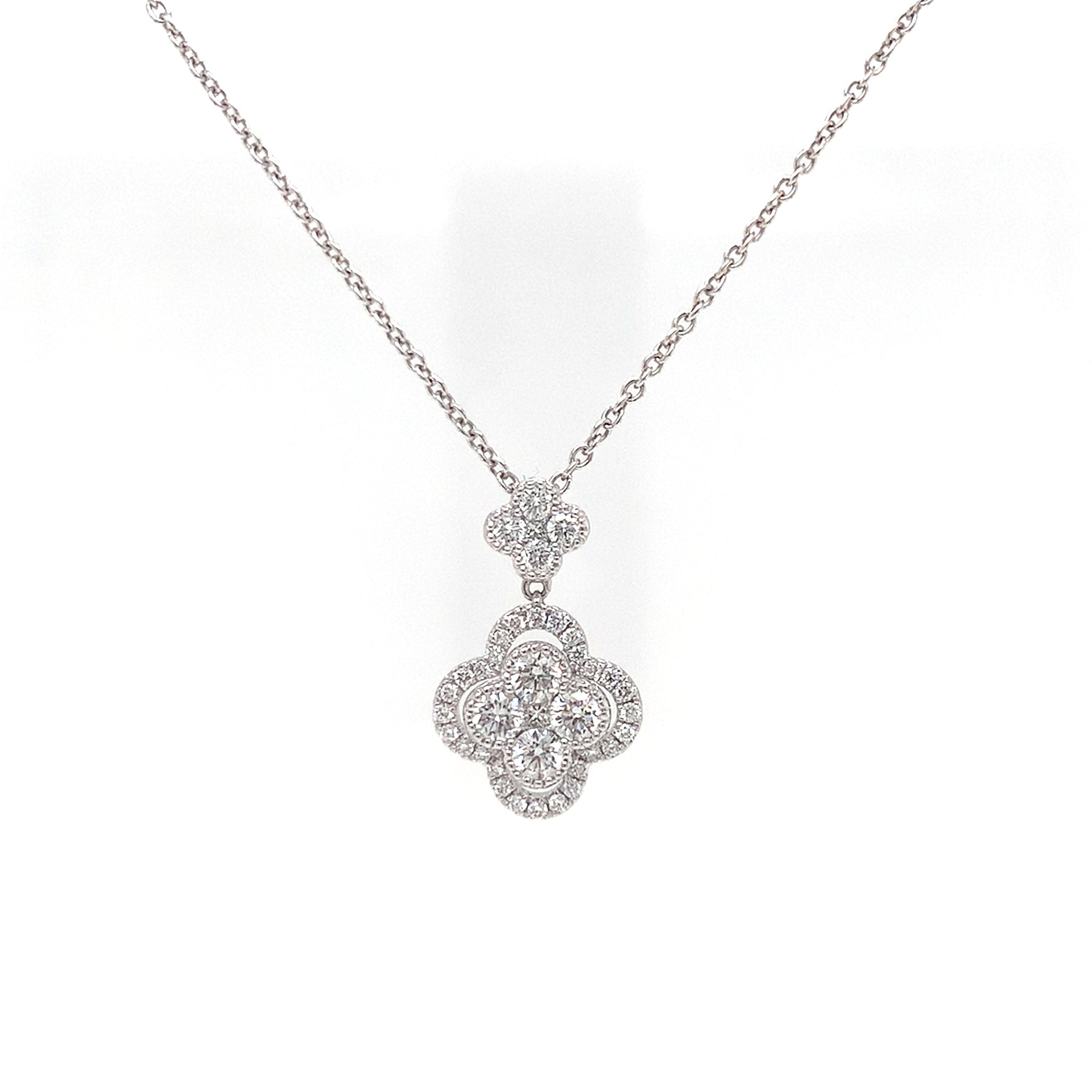 Elevate your everyday elegance with this exquisite Double Clover pendant, a timeless symbol of luck and sophistication. Crafted from premium 18kt white gold, featuring a stunning 0.05ct princess-cut diamond at its heart, complemented by 36 brilliant round diamonds totalling 0.60ct, this pendant radiates refined sparkle and grace. Perfectly matches to any other pieces in our clover range.