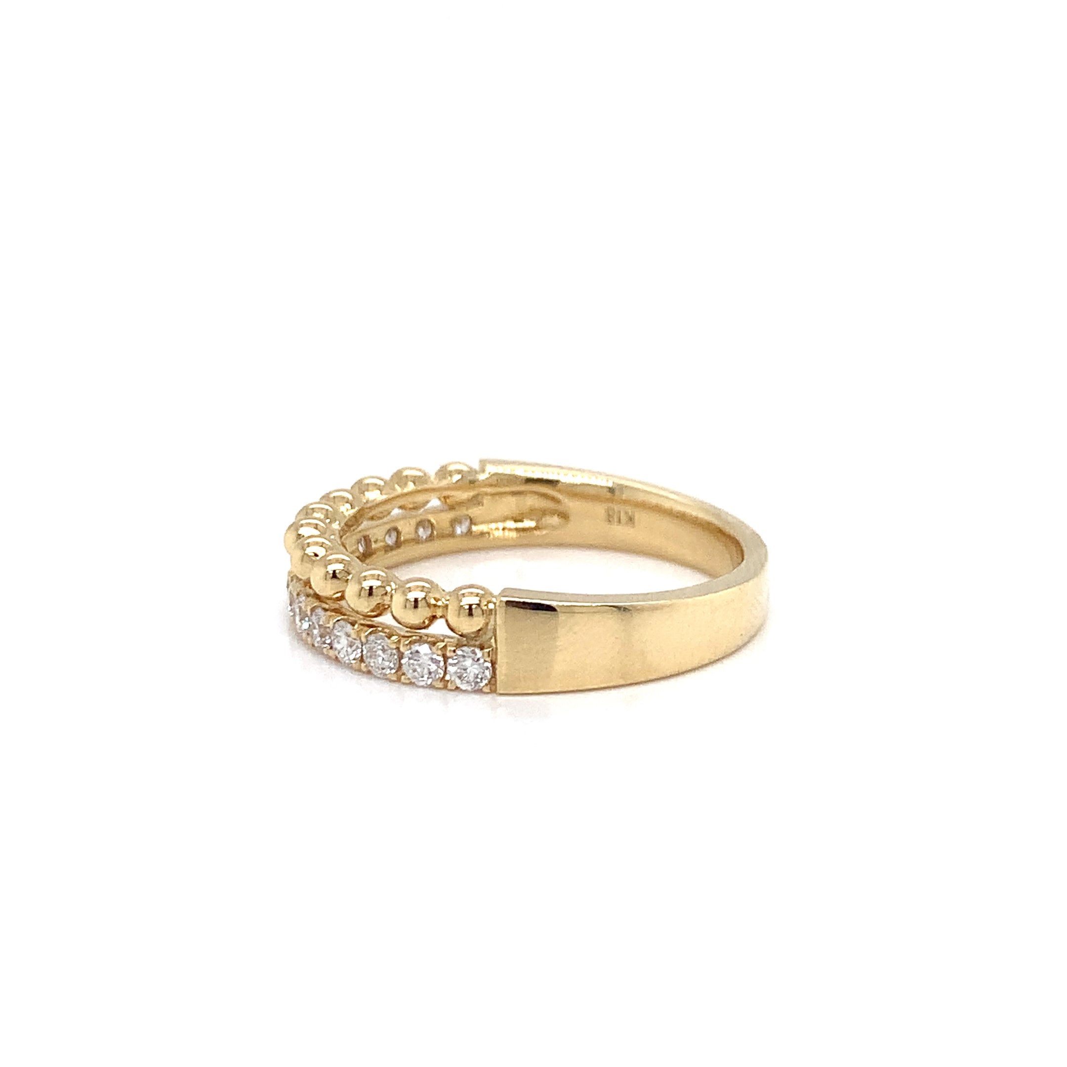 Introducing the Gatsby Grande. This ingeniously designed piece is set in 18kt yellow gold and features round diamonds totalling 0.36 carats, each stone carefully selected for brilliance. The playful two-in-one concept allows you to wear it as a statement ring or separate the bands for versatile styling options.